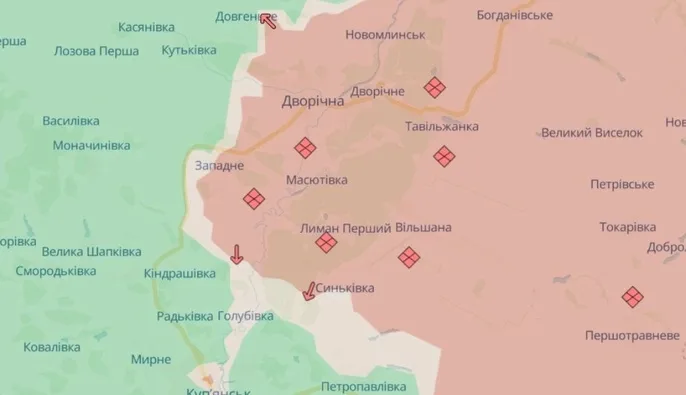 Російська армія мала успіхи в районі села Синьківка у Харківській області. Про це повідомляє аналітичний проєкт DeepState.
