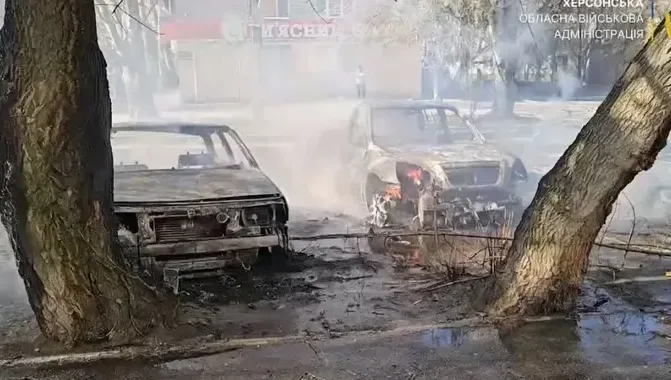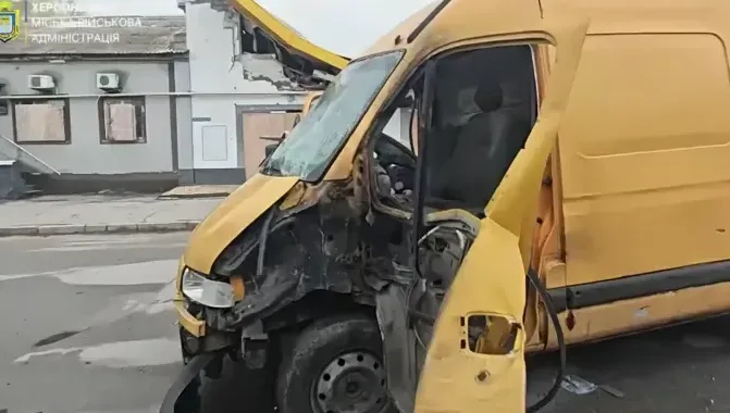 Російський дрон атакував мікроавтобус у Херсоні, поранений водій.